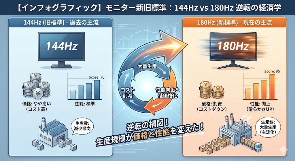 結論から言うと、現在の液晶パネル生産の主流が144Hzから180Hzへ完全に移行したからです。多くのメーカーが180Hzパネルを大量生産しているため、最新の180Hzモデルの方が、型落ちの144Hzモデルよりも価格が安いという状況が生まれています。