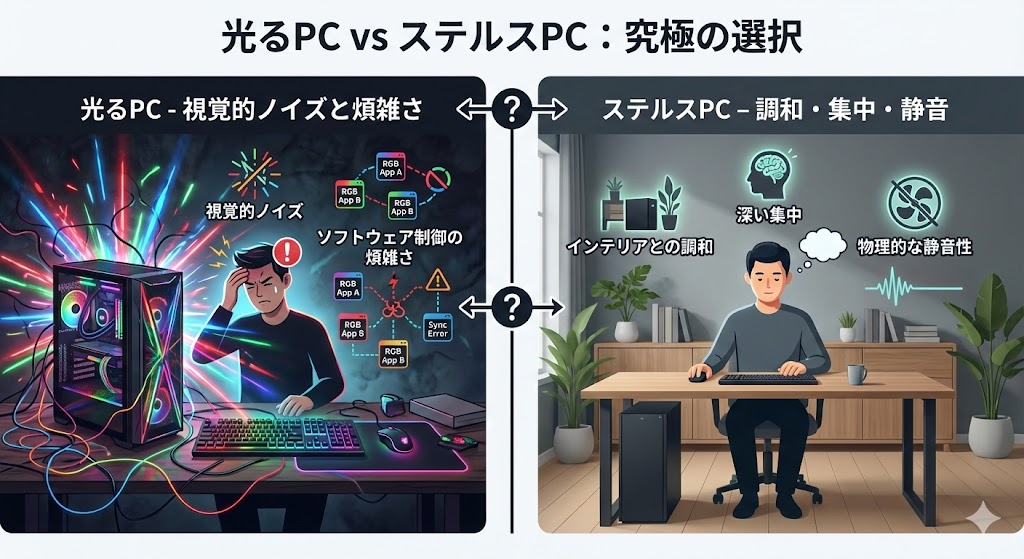 本記事では、あえて光らせない「ステルスビルド」の専門家として、あなたの審美眼に叶うPCケースの選び方を伝授します。ソフトウェアの消灯設定に裏切られない「物理的な解決策」から、意外な盲点であるドスパラの無骨なケースの価値まで。思考を研ぎ澄ますための、大人のPC選定ガイドを始めましょう。