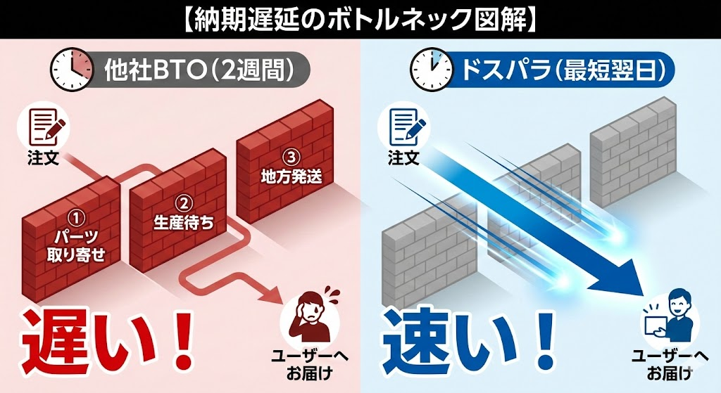 なぜドスパラだけがこれほどまでに早いのか、そして他社で注文すると、なぜあなたの貴重な時間が奪われるのか。その残酷な真実をお伝えします。